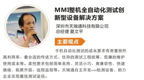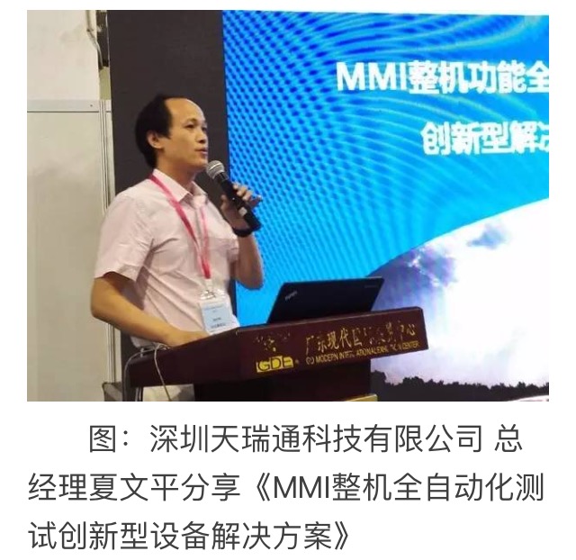 2017年5月24日,我司总经理夏文平先生参加《2017手机智能制造高峰论坛》,并发表了题为《MMI整机全自动化测试创新型设备解决方案》的演讲。对MMI测试现状及业界瓶颈做了深刻的分析, 并讲述了天瑞通公司如何克服技术难点,研发出创新型的解决方案。通过这次的演讲,公司的研发理念及先进技术得到了论坛嘉宾的认可。